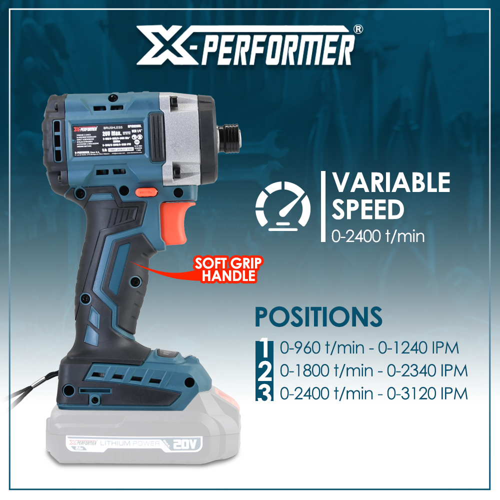 | Retour Vous avez une question Marque: X-PERFORMER Garantie: 3 ans Description: Avec cette visseuse à chocs sur batterie 20 V de la marque Constructor, effectuez vos travaux de vissage sans effort. Elle possède un couple maximal de 220 Nm ainsi qu'une vitesse variable 0-2400 tours par minute. La visseuse à chocs XPID220BL vous offre une expérience d'utilisation excellente. Elle dispose d'une lampe LED qui éclaire la zone de travail ainsi qu'une poignée softgrip qui assure une prise en main optimale. Grâce à une puissance de 20V, une vitesse de rotation variable de 0 à 2400 tours par minute et un moteur brushless apportant une puissance plus élevée et une durée de vie plus longue cette visseuse à chocs répondra à toutes vos exigences, même les plus élevées. Vous pourrez sélectionner la vitesse adéquate par rapport au travail à effectuer : position 1 (0-960t/min et 0-1240 coups/min) – position 2 (0-1800 t/min et 0-2340 coups/min) – position 3 (0-2400 t/min et 0-3120 coups/min). Vous achetez séparément votre batterie 2 Ah (XPBAT20-2A), 4Ah (XPBAT20-4A), 6 Ah (XPBAT20-6A) ou 8 Ah (XPBAT20-8A), votre chargeur rapide (XPCHAR20-SR1, XPCHAR20-SSR3, XPCHAR20-SSR4, XPCHAR20-DR1 ou XPCHAR20-DSR2) ou votre kit de démarrage (XPSTART-D4A23, XPSTART-S2A ou XPSTART-S24A) lors de l'acquisition de votre première machine puis au gré de vos envies ou de vos besoins, vous pouvez acheter une seconde machine sans devoir investir dans une nouvelle batterie ni un nouveau chargeur, ce qui représente une économie non négligeable (Attention, les machines X-Performer blanches ne sont pas compatibles avec ces batteries et ces chargeurs). La visseuse à chocs sans fil XPID220BL est garantie 10 ans. Caractéristiques : - Puissance: 20V max - Couple: 220 Nm - Vitesse variable: 0-2400 t/min - Impact variable : 0-3120 coups/min - Mandrin : 1/4'' HEX - Moteur brushless - Livré en boite couleur sans batterie ni chargeur - Poignée soft grip - Lampe led éclairant la zone de travail - Avec un crochet permettant d'attacher la visseuse à la ceinture Code EAN/GLN: 5411074313517 Poids: 1.42 kg Stock: disponible ECO-participation pour une livraison en Belgique: 0,53 € HT Les photos: Vue principale: 110x110 px, 300x300 px, 500x500 px, 1000x1000 px De face: 110x110 px, 300x300 px, 300x300 px, 1000x1000 px De derrière: 110x110 px, 300x300 px, 300x300 px, 1000x1000 px Du dessus: 110x110 px, 300x300 px, 300x300 px, 1000x1000 px Les catégories: Outillage, Visseuse Mots clés: Visseuse, chocs, 220Nm, avec, moteur, brushless, livrée, sans, batterie, chargeur |