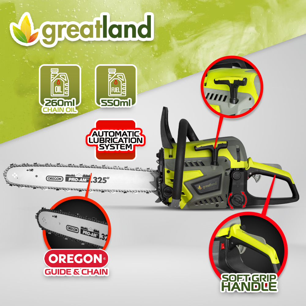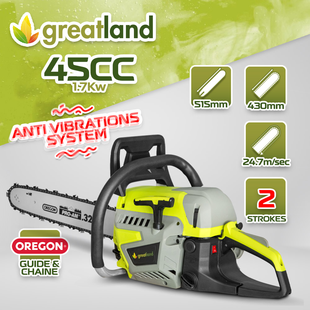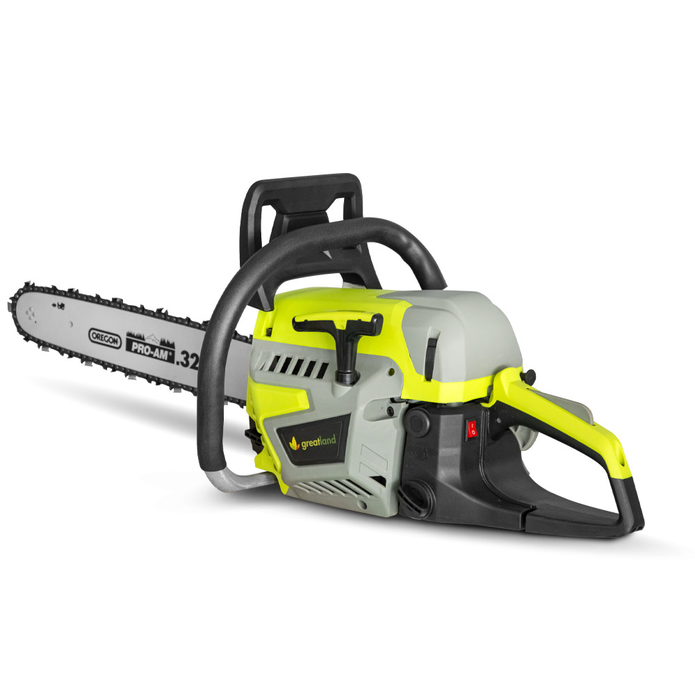 | Retour Vous avez une question Marque: Greatland Garantie: 1 an Description: Cette tronçonneuse thermique 45 CC de la marque Greatland est idéale pour l'abattage des arbres de petites et moyennes tailles, le débitage du bois de chauffage ou tout autres travaux forestiers. Équipé d'une chaîne et d'un guide Oregon de 51.5 cm, cet outil atteste d'une excellente qualité de coupe. Elle est équipée d'un système anti vibrations pour un plus grand confort d'utilisation Cette tronçonneuse thermique est garantie 3 ans. Caractéristiques : - Cylindrée : 45 CC - 2 temps ratio essence : huile 40 : 1 - Puissance moteur : 1.7 Kw - Régime moteur max : 10000 t/min - Capacité du réservoir d'essence : 550 ml - Capacité du réservoir d'huile: 260 ml - Longueur du guide: 515 mm - Longueur de coupe: 430 mm - Vitesse de chaîne: 24.7 M/sec - Poids: 6.7kg - Chaîne 0.325'' - Graissage automatique de la chaîne - Pas de la chaîne : 8.25mm (0.325'') - Jauge : 1.47mm (0.058'') - Garantie : 3 ans Code EAN/GLN: 5411074229122 Poids: 7.70 kg Stock: disponible ECO-participation pour une livraison en Belgique: 0,00 € HT Les photos: Vue principale: 110x110 px, 300x300 px, 500x500 px, 1000x1000 px De face: 110x110 px, 300x300 px, 300x300 px, 1000x1000 px De derrière: 110x110 px, 300x300 px, 300x300 px, 1000x1000 px Du dessus: 110x110 px, 300x300 px, 300x300 px, 1000x1000 px Les catégories: Jardin, Tronconneuse Mots clés: Tronçonneuse, thermique, 45CC, guide, chaîne, Oregon, Greatland |