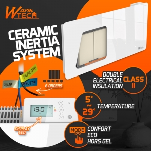 | Retour Vous avez une question Marque: WARM TECH Garantie: 2 ans Description: Préparez-vous à affronter l'hiver avec ce radiateur à inertie céramique 2000 W de la marque Warm Tech. Équipé d'un thermostat Lcd, ce radiateur est facilement programmable. Il diffuse une chaleur douce, constante et silencieuse, tout en réduisant votre consommation d’énergie. Ce radiateur à inertie sèche est livré avec des fixations murales. Il mesure 95 cm de largeur, 45 cm de hauteur et 9.7 cm de profondeur. Le corps de chauffe est en pierre céramique, ce qui vous garantit une chaleur douce, constante et silencieuse qui est accumulée par la pierre puis est restituée de manière homogène (il continue de diffuser la chaleur même éteint). En plus de son côté esthétique, la façade en verre améliore le confort thermique ressenti et est très facile à nettoyer. Caractéristiques : - Puissance: 2000 W - Dimensions: 95 x 45 x 9.7 cm - Réglage température : de 5 à 29 degrés - Modes : Confort - Eco - Hors gel - Off - 3 programmes hebdomadaires préinstallés + 1 personnalisable - Thermostat avec display Lcd (fil pilote 6 ordres) - Fonction automatique d’ouverture de fenêtres - Verrouillage du clavier - Indicateur de consommation d’énergie - Fixation murale - Couleur : blanc - Protection IP24 : peut être installé dans une salle de bain (uniquement dans le volume 2 ou hors volume conformément aux normes NF C 15-100. - Classe II : double isolation électrique, sans mise à la terre requise - Convient pour une pièce d’environ 20M² - Poids net : 14.9kg - Garantie : 2 ans Code EAN/GLN: 5411074251635 Poids: 16.50 kg Stock: disponible ECO-participation pour une livraison en Belgique: 1,75 € HT Les photos: Vue principale: 110x110 px, 300x300 px, 500x500 px, 1000x1000 px De face: 110x110 px, 300x300 px, 300x300 px, 1000x1000 px De derrière: 110x110 px, 300x300 px, 300x300 px, 1000x1000 px Du dessus: 110x110 px, 300x300 px, 300x300 px, 1000x1000 px Zoom: 110x110 px, 300x300 px, 300x300 px, 1000x1000 px Les catégories: Maison, Chauffage Mots clés: Radiateur, inertie, céramique, avec, façade, verre, 2000, IP24, pilote, ordres. |