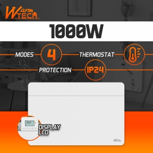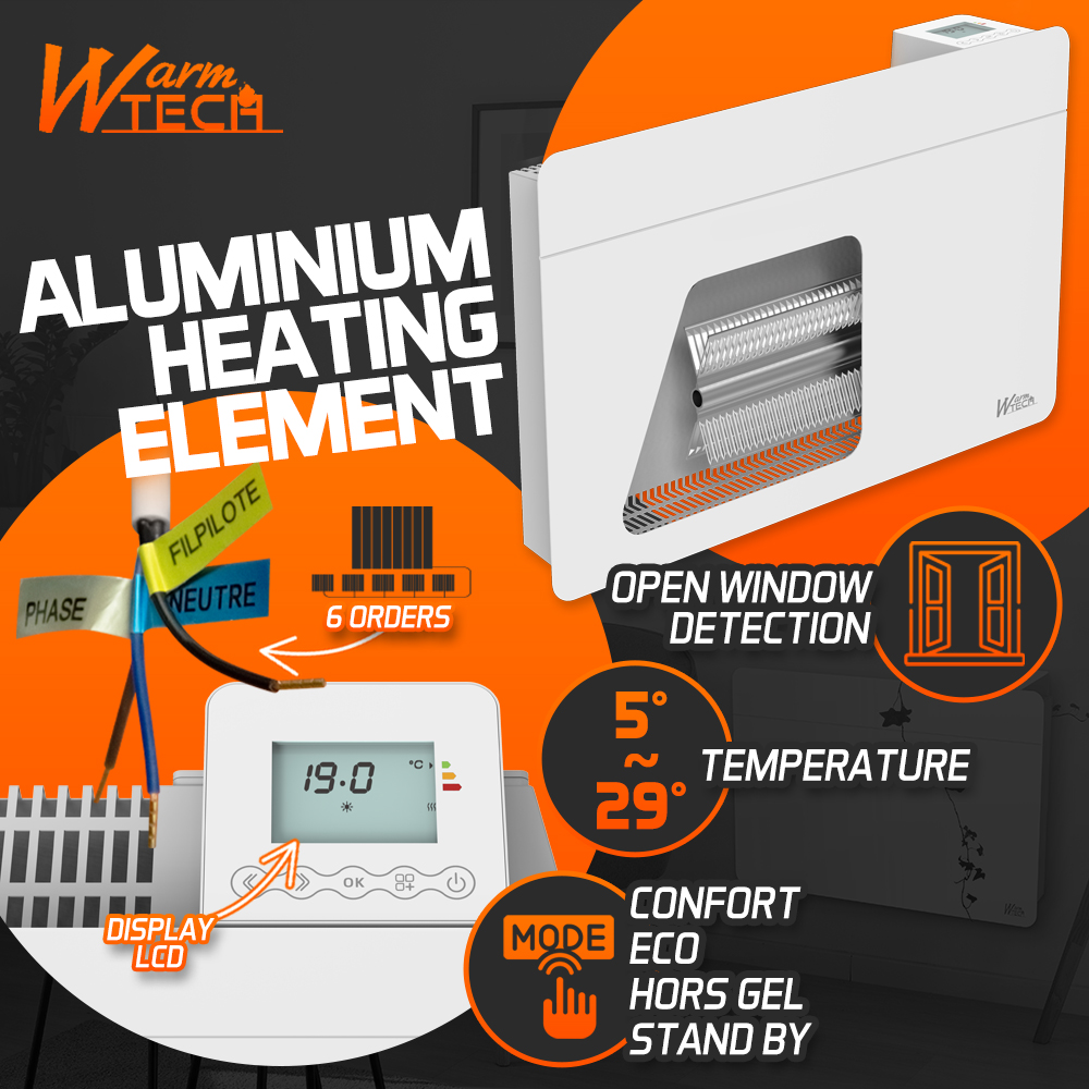 | Retour Vous avez une question Marque: WARM TECH Garantie: 2 ans Description: Ce chauffage mural d’une puissance de 1000 W permet de chauffer rapidement votre intérieur. Il dispose de 4 modes (Confort, Eco, Hors gel, Stand by) et permet de régler la température de 5 à 29° pour une utilisation plus adaptée à vos besoins. Il permet un réglage facile de la température grâce à son thermostat électronique avec display LCD. Ce convecteur Warm Tech possède une protection contre la surchauffe ainsi qu’un système de détection de fenêtre ouverte. Vous ne consommerez plus d’énergie inutilement. Il est livré avec des fixations murales. Caractéristiques: - Puissance: 1000 W - Thermostat avec display Lcd (fil pilote 6 ordres) - Modes: Confort - Eco - Hors gel - Stand by - 3 programmes hebdomadaires préinstallés + 1 personnalisable - Verrouillage du clavier - Réglage de température de 5 à 29° - Protection contre la surchauffe - Voyant lumineux de fonctionnement - Elément de chauffe en aluminium - Livré avec fixations murales - Dimensions: 54x9.7x35.4 cm - IP24 - Détection en cas de fenêtre ouverte - Poids : 4.6kg Code EAN/GLN: 5411074249168 Poids: 5.50 kg Stock: disponible ECO-participation pour une livraison en Belgique: 0,92 € HT Les photos: Vue principale: 110x110 px, 300x300 px, 500x500 px, 1000x1000 px De face: 110x110 px, 300x300 px, 300x300 px, 1000x1000 px De derrière: 110x110 px, 300x300 px, 300x300 px, 1000x1000 px Du dessus: 110x110 px, 300x300 px, 300x300 px, 1000x1000 px Zoom: 110x110 px, 300x300 px, 300x300 px, 1000x1000 px Les catégories: Maison, Chauffage Mots clés: Chauffage, électrique, mural, 1000W, IP24, pilote, ordres |