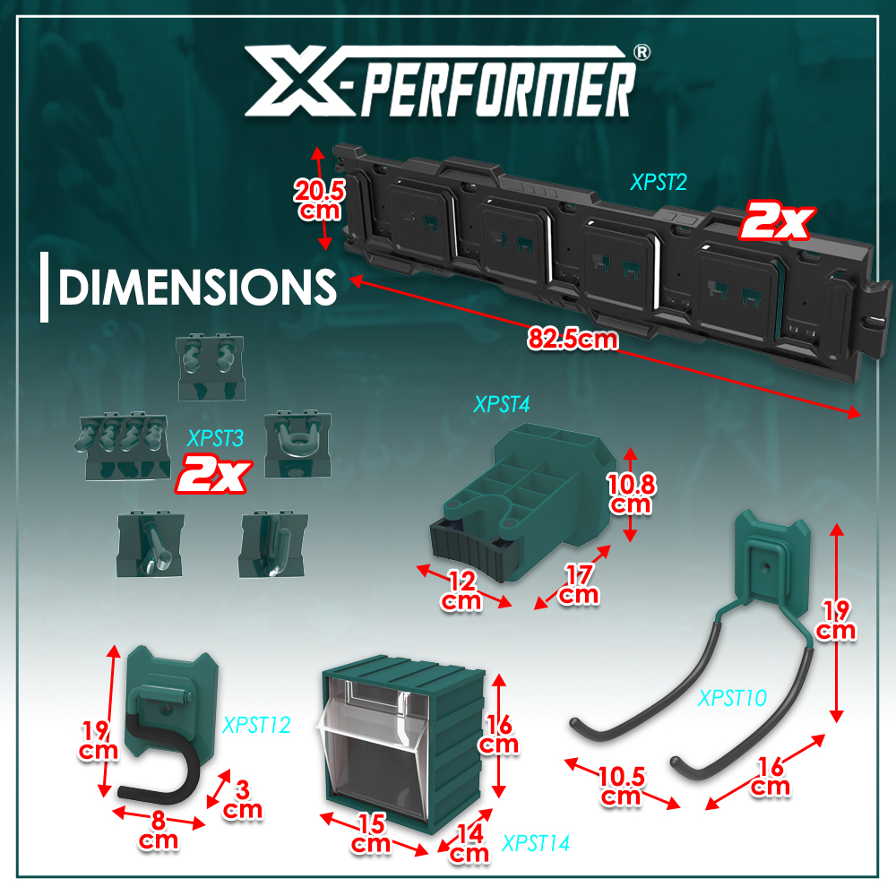 | Retour Vous avez une question Marque: X-PERFORMER Garantie: 3 ans Description: Le Starter Kit XPST1 – XPERFORMER est un kit de démarrage clé en main. Il constitue une base complète et immédiatement opérationnelle. Ce concept est conçu pour vous aider à personnaliser votre rangement à l’infini Le kit comprend les éléments suivants : • XPST2 – 2 × Panneaux arrière muraux – largeur 80 cm Support de fixation robuste pour l’ensemble du système XPERFORMER • XPST3 – 1 × Set de 10 crochets de base Pour suspendre les outils standards et accessoires courants • XPST4 – 1 × Crochet à pince Dimensions : L 8 × P 6,5 × H 14,5 cm Idéal pour le maintien d’outils à manche ou objets cylindriques • XPST10 – 1 × Double crochet courbé Dimensions intérieures : L 8 × P 13,5 cm Dimensions extérieures : L 10 × H 15 × P 15,3 cm Pour outils plus volumineux ou doubles supports • XPST12 – 1 × Crochet en S Dimensions intérieures : L 6 × P 4,3 cm Dimensions extérieures : L 7 × H 1,5 × P 10,5 cm Solution polyvalente pour suspensions rapides • XPST14 – 1 × Boîte de rangement Dimensions : L 15 × H 16 × P 14 cm Pour le stockage de petites pièces, consommables ou accessoires Chaque composant est conçu pour être repositionné facilement selon vos besoins. Faisant partie intégrante de la gamme de rangement XPERFORMER, ce produit s’inscrit dans un concept totalement modulable et interchangeable (crochets, supports, bacs, accessoires spécialisés). Ajoutez, déplacez, réorganisez : votre mur évolue au rythme de votre équipement, en toute simplicité et sans contraintes. Caractéristiques : - Installation simple et rapide - Organisation visuelle efficace - Système modulaire et évolutif - Optimisation de l’espace mural - Modulable à l’infini Code EAN/GLN: 5411074253417 Poids: 4.40 kg Stock: disponible ECO-participation pour une livraison en Belgique: 0,00 € HT Les photos: Vue principale: 110x110 px, 300x300 px, 500x500 px, 1000x1000 px De face: 110x110 px, 300x300 px, 300x300 px, 1000x1000 px De derrière: 110x110 px, 300x300 px, 300x300 px, 1000x1000 px Du dessus: 110x110 px, 300x300 px, 300x300 px, 1000x1000 px Les catégories: Maison, Rangement Mots clés: démarrage, 16pcs, pour, concept, rangement, X-Performer |